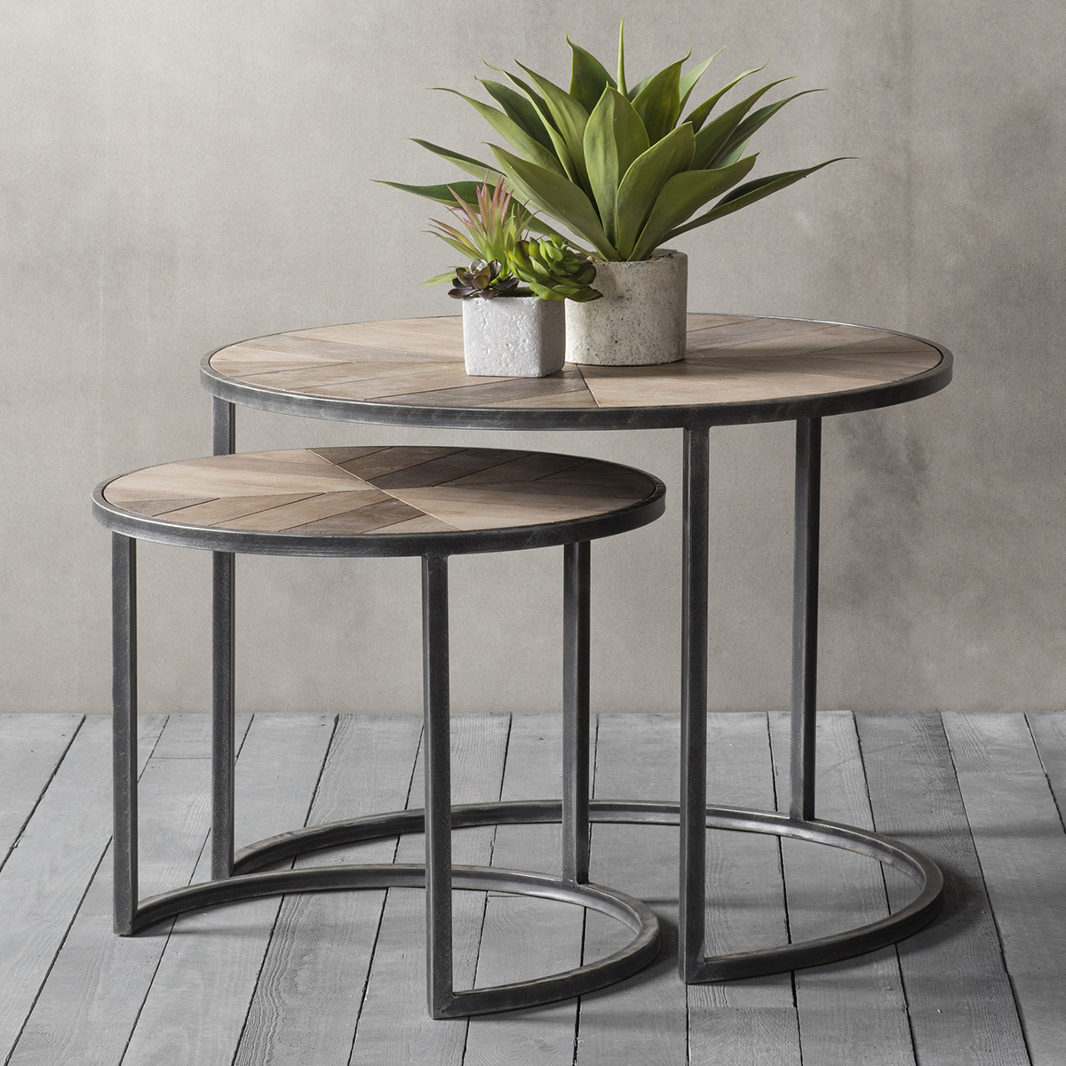 This functional nest of 2 tables features a chevron effect weathered timber inlaid top and gun-metal metallic base that suits any interior with nod towards industrial and eclectic design.